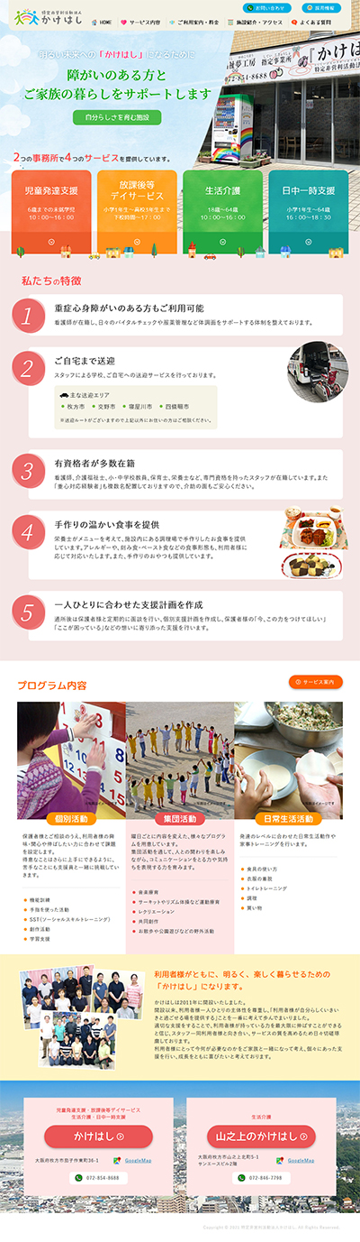 特定非営利活動法人「かけはし」は、児童発達支援、放課後デイサービス、生活介護、日中一時支援など、障がいをお持ちの方とそのご家族の暮らしをサポートし、明るい未来への架け橋となります。